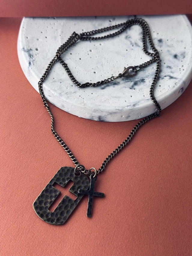 Collar de Largo medio y cadena finita con doble dije martelé de chapa y cruz calada. Color bronce