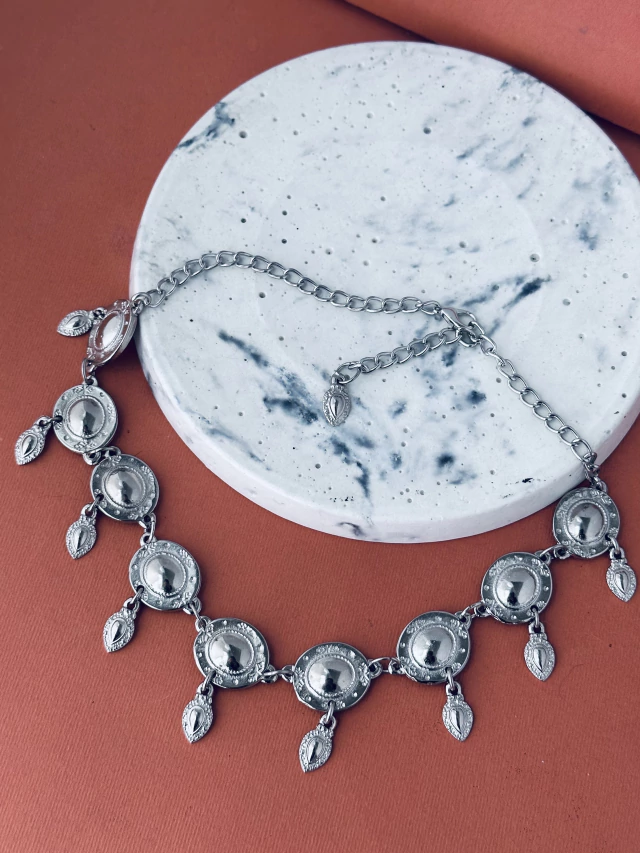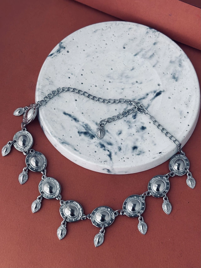Collar de cuentas metalicas con dijes de gita colgando en cada moneda.