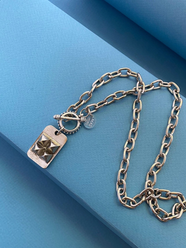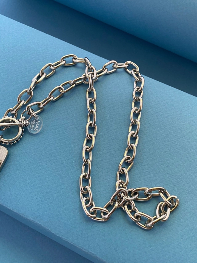 Collar de eslabón ovalado, con cierre marinero al frente y dije con cuatro tachas.