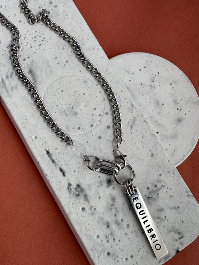 Cadena de largo medio, cierre delantero y dije doble cara, hecho en Zamak (zinc aluminio magnesio y cobre) grabado "EQUILIBRIO" y del otro lado " "CUERPO- MENTE - ESPÍRITU"