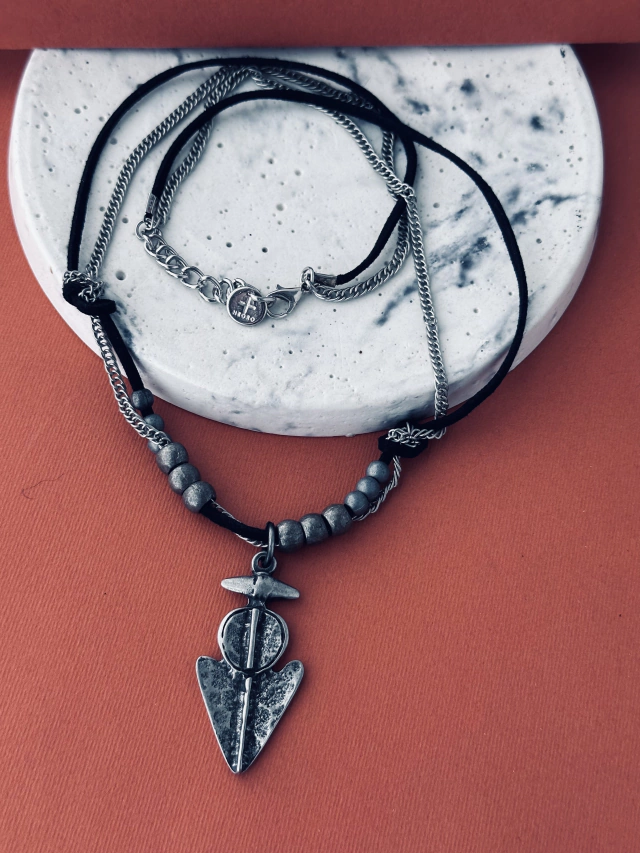 Collar de tiento y cadena combinados con dijes en y cuentas metalicas de baño niquel negro.