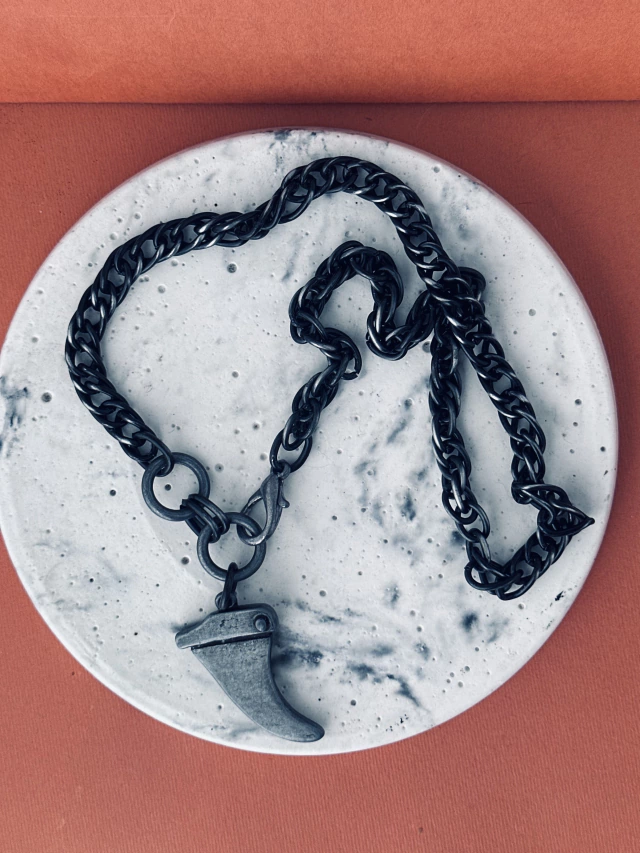 Collar de largo medio con cadena color niquel oscuro con dije central de quilla y cierre delantero.