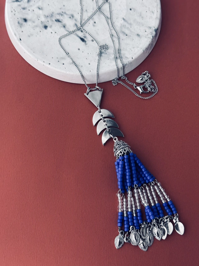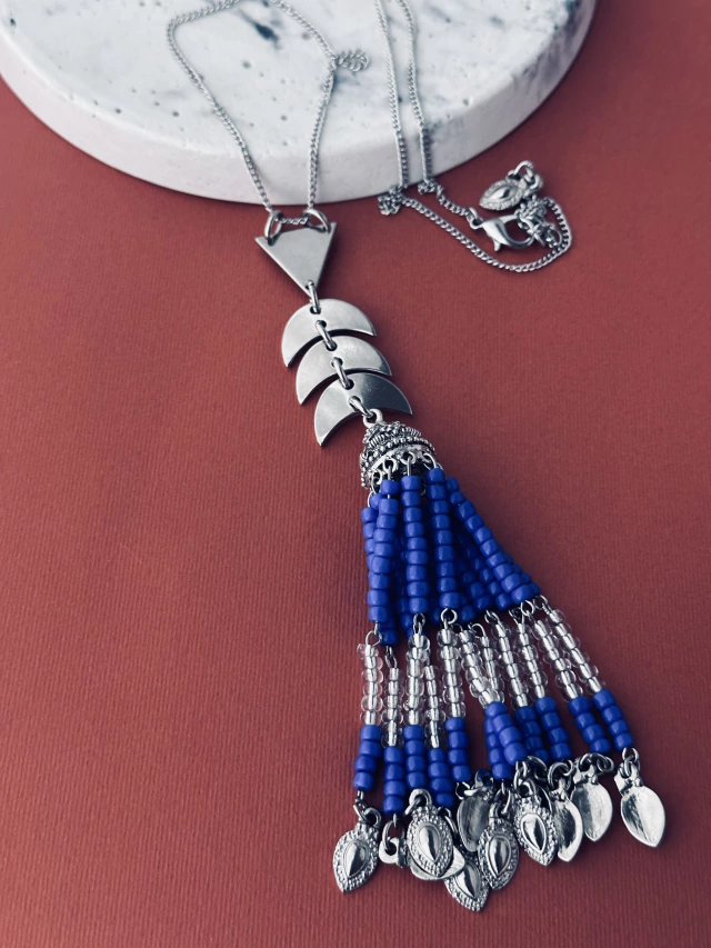 Cadena super finita con dije dije central de flecos con mostacillas de colores y terminal de gotas plateadas.