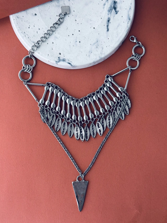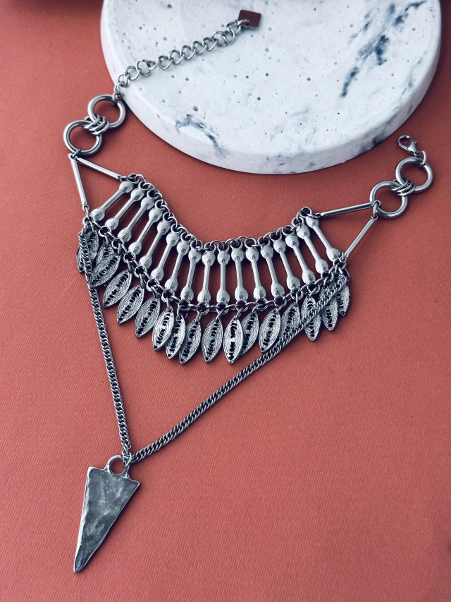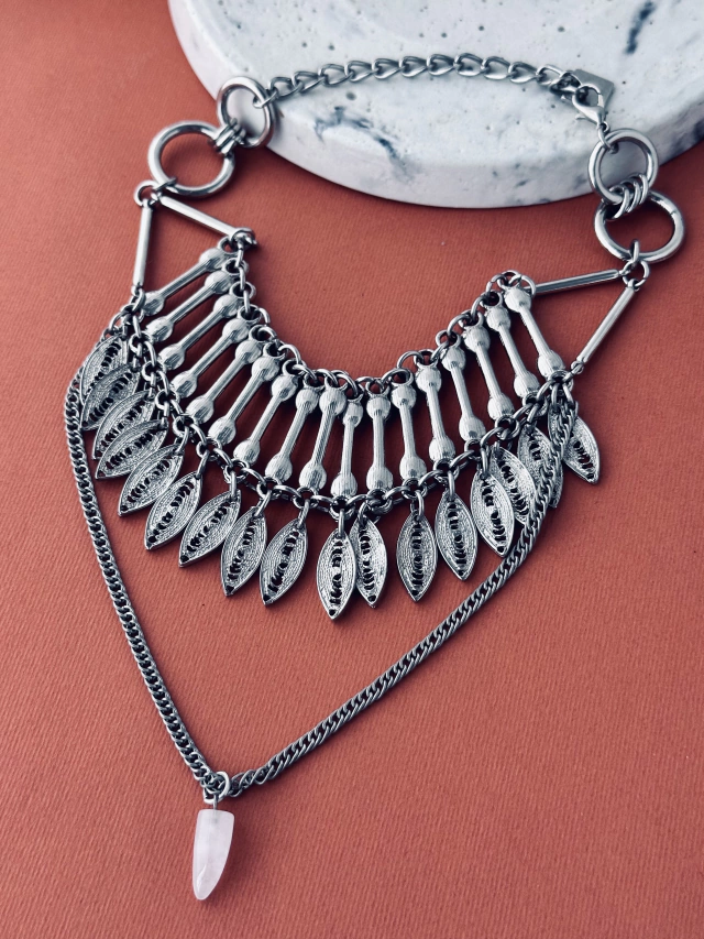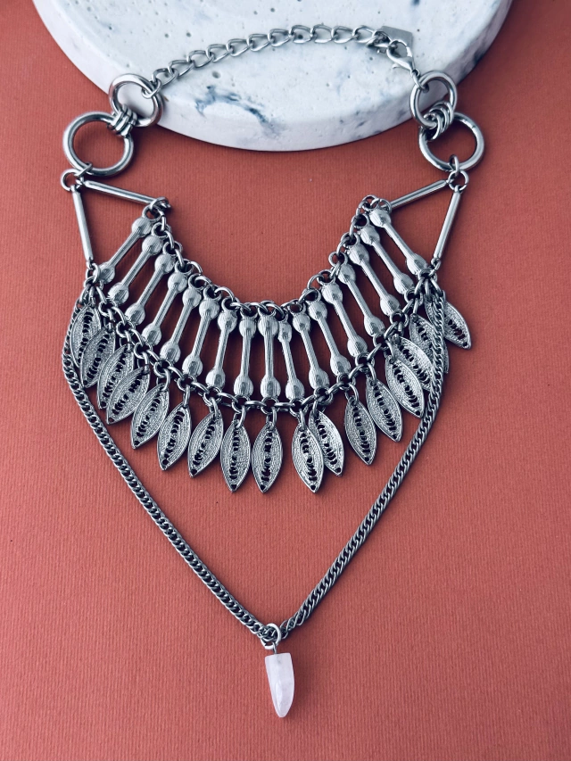 Collar corto, pegado al cuello con doble largo, hay dos variantes, la cadena que cae tiene un mini cuarzo o un dije en forma traingular.