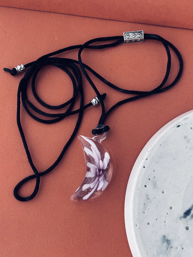 Dije de murano en forma de Luna de crital con flor adentro. Y tiento negro de seda.