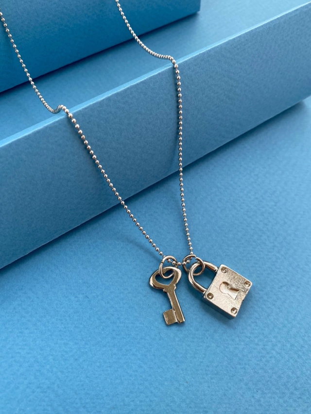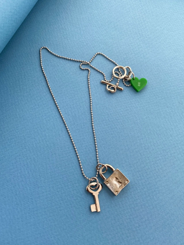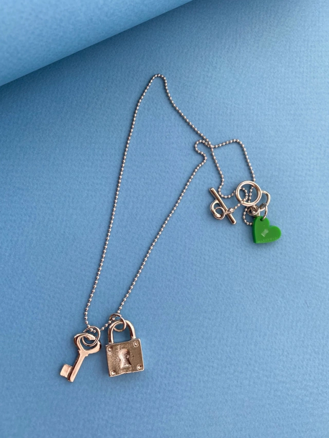 collar corto de cadena bolita miniatura color niquel brillante con dijes de candado, y llave. y corazon acrílico en el cerramiento.