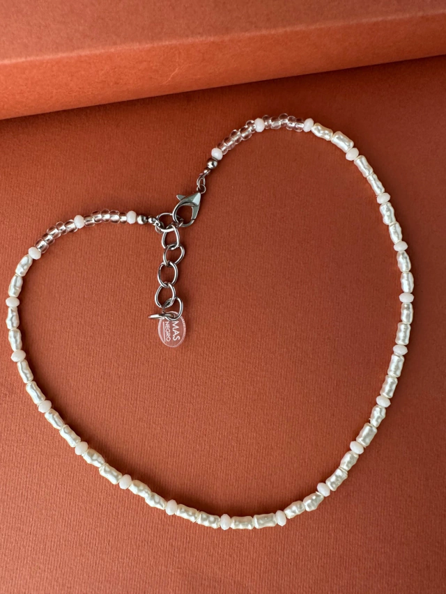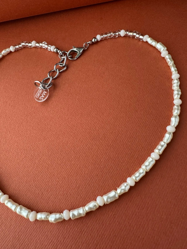Perlas fantasia de forma organica alargada color nacaradas, combinadas con canutillos transparentes y cristal checo colo natural.
