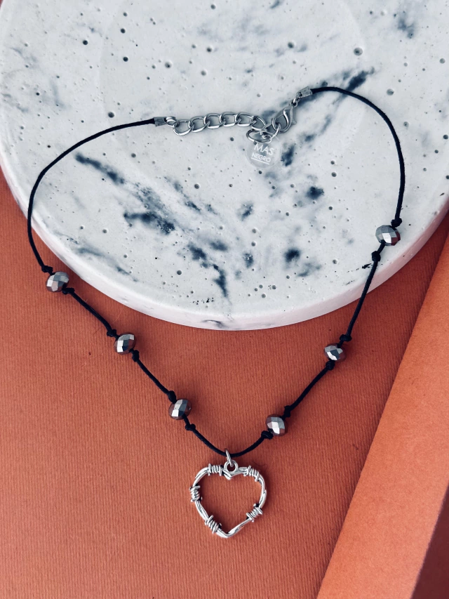 Collar corto de hilo encerado con dije Corazón de alambre de pua y cristales.
