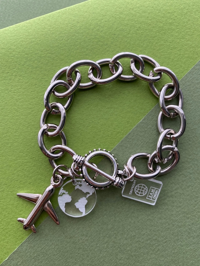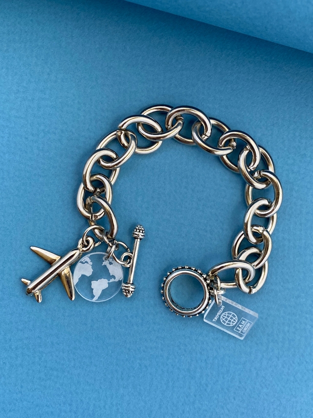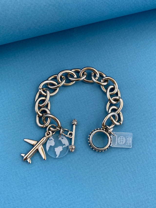 Pulsera de eslabones grandes redondos con un cierre marinero, dije de avion metálico y dos sines en acrílico cristal; mundo y pasaporte.