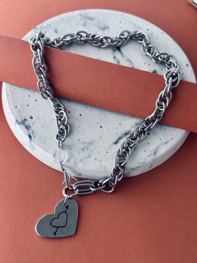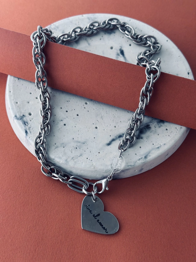 Collar de largo medio y cadena gruesa turbillon con dije central de corazón con doble cara, y cierre al frente.